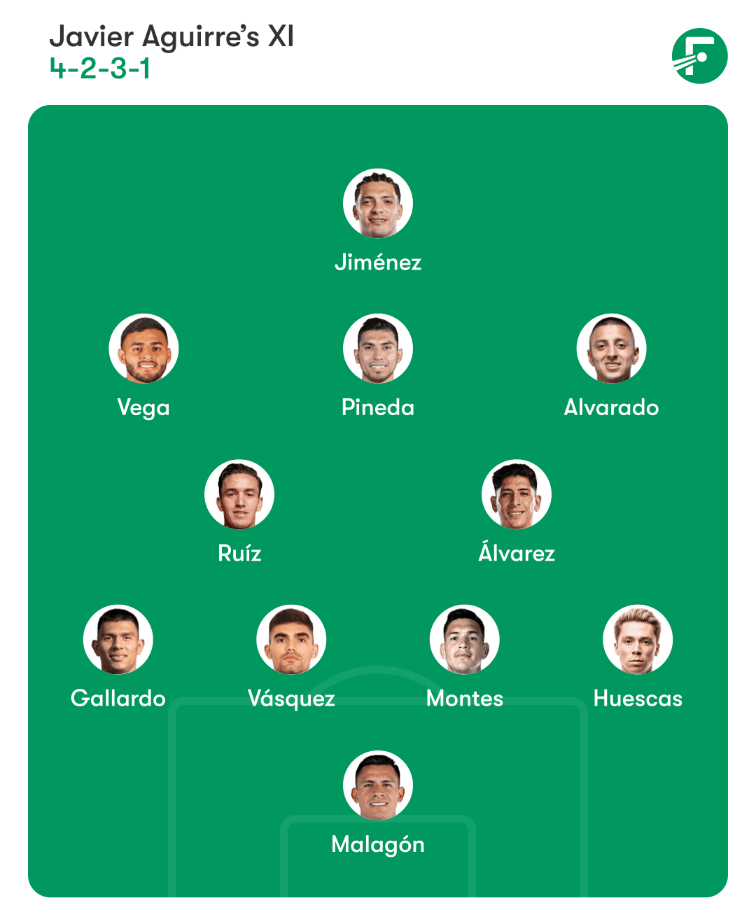 Malagón; Huescas, Montes, Vásquez, Gallardo; Álvarez, Ruíz, Alvarado, Pineda, Vega; Jiménez