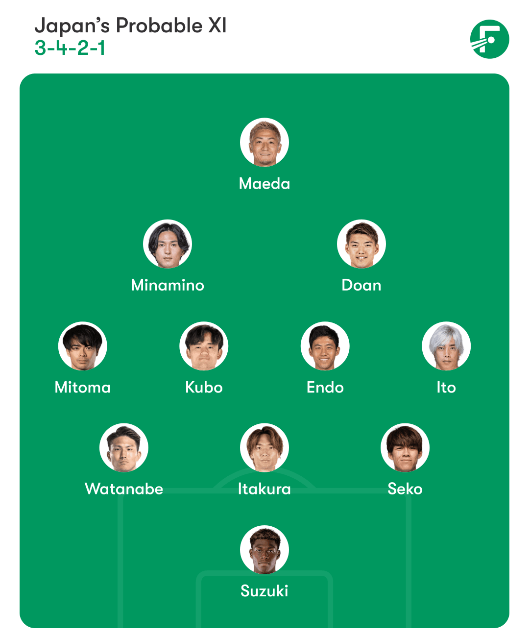 - Attack: Eintracht Frankfurt’s Ritsu Doan, enjoying a stellar start to the Bundesliga season, will partner former Liverpool player Takumi Minamino in attack.